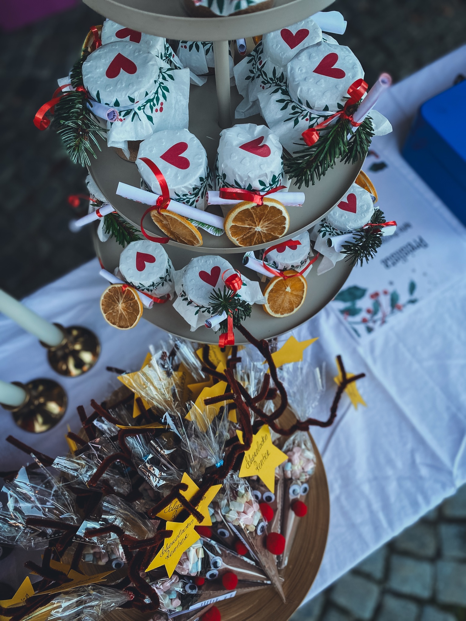 Nicht nur duftende Waffeln mit Puderzucker, nein auch mit Glitzereffekt gab es bei uns zu kaufen und liebevoll hergestellte und verpackte kleine Geschenke. Ob Marmelade, Likör oder Sirups, Punschgewürz, selbst gebackene Plätzchen oder kleine Rudolf-Schokotütchen um sich an kalten Wintertagen einen heißen Kakao mit süßen Marshmallows zuzubereiten, für Jeden war etwas dabei.
